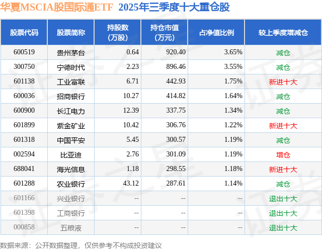从基金鸿沟来看,中原MSCIA股外洋通ETF基金2025年三季度公布的基金鸿沟为2.52亿元,较上一期鸿沟2.43亿元变化了917.67万元,环比变化了3.77%。该基金最新一期金钱树立为:股票占净值比92.65%,无债券类金钱,现款占净值比6.62%。从基金执仓来看,该基金当季前十大股票仓位达17.85%,第一大重仓股为贵州茅台(600519),执仓占比为3.65%。