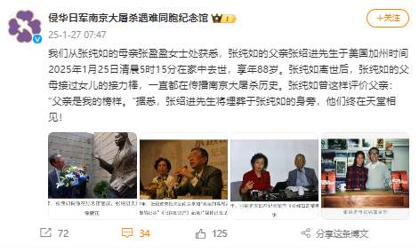 1月27日,据侵华日军南京大屠杀遭难本家缅念念馆官方微博发布音信,张纯如的父亲张绍进先生厌世,享年88岁。